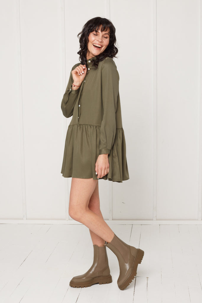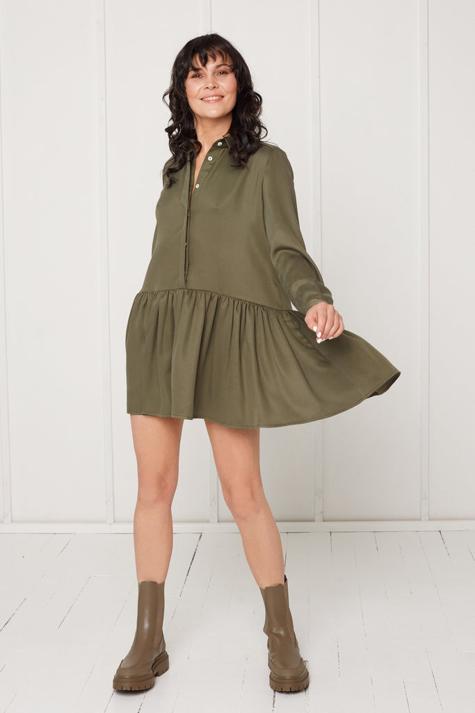 This oversized mini shirt dress made from extra soft tencel fabric is designed to last. The essential dress will make you feel comfortable and playful no matter the situation. The dress features a comfortable fit with elegant front frill, side pockets.